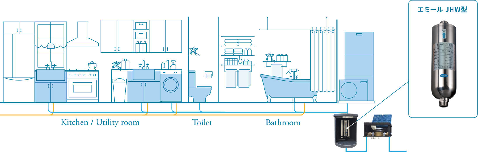 與一般裝在流理台附近的市售淨水器不同,emiiR屬於全戶式水處理裝置,只要安裝一台在進水總管,全家受惠。