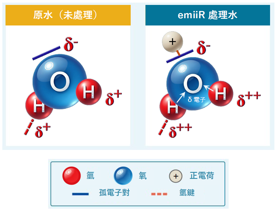 水分子經過emiiR 處理後,藉由陶瓷表面產生的界面動電現象,使水分子的電性改變。